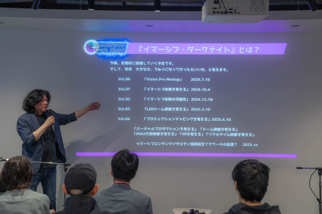 Apple Vivion Pro、ラスベガスSphere、科学館、プラネタリウムなどのドームシアター、IMAXアイマックスなどの大型シアター、バーチャルプロダクション、今までの映像体験とは一線を画する映像やビジュアル体験やイマーシブコンテンツに関心を持つクリエイターやアーチスト、企業の方々とまずは交流し、語り合いたいと思います。そこにあるみなさんの想いを映像の形で残したり、そこに溜まった知見やノウハウを新たに情報発信出来たりしたらいいな、と思っています。